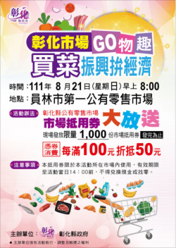 ▲彰化縣政府為吸引更多消費者進入傳統市場消費,8月20日起辦理「彰化市場快閃趣,買菜振興拚經濟」活動,憑市場抵用券消費每滿100元即可折抵50元,活絡市場買氣。(圖/記者林明佑翻攝) 【焦點時報/記者林明佑報導】受covid-19嚴重特殊傳染性肺炎疫情影響,公有市場攤商人潮不如以往,隨著防疫政策陸續鬆綁,彰化縣政府為吸引更多消費者進入傳統市場消費,8月20日起特別辦理「彰化市...... [閱讀更多]