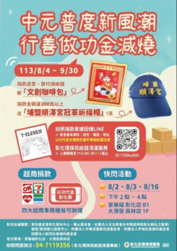 【焦點時報/記者林明佑報導】農曆7月民俗祭祀即將到來,彰化縣環保局彰揚中元普度新風潮,提倡紙錢「替代燒」方案,凡於8月4日起至9月30日期間前往四大超商以功代金捐款並指定「彰化縣」社福團體,即可憑超商捐款收據,上傳至彰化環保局紙錢清運Line帳號(ID:@158kcebh),兌換環保局向社福團體訂製的「文創咖啡包」乙份,並且,單筆捐款金額達300元(含)以上,即可贈送埔鹽順澤宮冠...... [閱讀更多]