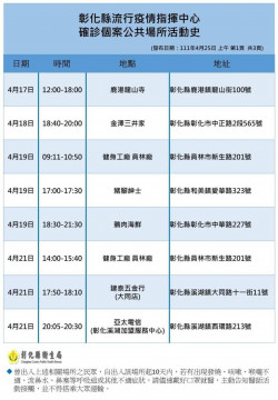 ▲彰化縣流行疫情指揮中心25日公布最新確診個案公共場所活動史,民眾若有相關重疊足跡,請做好自我健康監測。(圖/彰化縣政府提供) 【焦點時報/記者林明佑報導】中央流行疫情指揮中心今(25)日公布國內新增5108例本土個案,彰化縣疫情快訊防疫說明,縣長王惠美表示,彰化縣今天新增53例,其中外縣市感染個案20例、縣內感染個案20例、調查中個案13例,同時公布最新11處確診足跡,呼籲...... [閱讀更多]