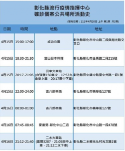 ▲彰化縣流行疫情指揮中心今(20)日公布12處確診個案公共場所活動史,民眾若有相關重疊足跡,請做好自我健康監測。(圖/彰化縣政府提供) 【焦點時報/記者林明佑報導】中央流行疫情指揮中心今(20)日公布國內新增2386例本土個案,彰化縣疫情快訊防疫說明,縣長王惠美表示,彰化縣今天新增18例,其中1例居隔發病、8例未列案號,同時公布確診足跡於4月15日至17日在春芳羊肉爐等12處...... [閱讀更多]