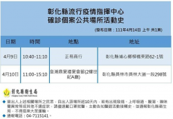 ▲彰化確診+5例,最新確診足跡分別於4月9日、10日在正易商行、皇潮鼎宴禮宴會館入列,民眾若有相關重疊足跡,請做好自我健康監測。(圖/ 彰化縣衛生局提供) 【焦點時報/記者林明佑報導】中央流行疫情指揮中心今(14)日公布國內新增874例本土個案,彰化縣疫情快訊防疫說明,縣長王惠美表示,彰化縣今天新增5例,其中2例未列案號,另公布確診足跡,分別於4月9日、10日在埔心鄉柳橋東路...... [閱讀更多]