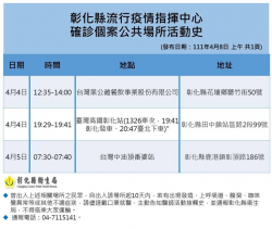 【焦點時報/記者林明佑報導】彰化縣今(8)日新增3人確診,彰化縣長王惠美說,其中2位未列案號,新增這3例是新竹縣營區群聚案延伸的案例,受居家隔離間發病,是個案與弟弟和友人在熱炒店群聚的案例,另公布有外縣市確診足跡來彰化,分別於4月4日、5日在彰化縣花壇鄉聽竹街50號「台灣黑公雞餐飲事業股份有限公司」、彰化縣田中鎮站區路2段99號「臺灣高鐵彰化站(1326車次,19:41彰化發車、...... [閱讀更多]