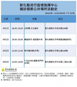 ▲外縣市確診足跡燒到彰化,精誠夜市、魚市爌肉飯、立軒閣文化廚苑、7-ELEVEN鑫彰安門市等4處曝光 ,目前已完成清消,若有相關重疊足跡,請做好自我健康監測。(圖/彰化縣政府提供) 【焦點時報/記者林明佑報導】彰化縣流行疫情指揮中心今(3)日下午公布有一外縣市確診足跡來彰化,該名確診者於4月1日、2日曾到訪彰化市成功路249號「立軒閣文化廚苑」、彰化市林森路「精誠夜市-紐西蘭...... [閱讀更多]