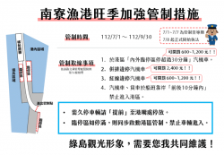 【焦點時報/記者王欣儀報導】 隨著暑假旅遊旺季來臨,為促進綠島南寮漁港交通順暢並提升觀光形象,臺東縣政府與臺東縣警察局攜手合作,將於7/1至9/30期間啟動「旺季加強管制措施」,管制內容除加強取締違停汽機車外,亦禁止汽機車於船班靠岸前、後10分鐘內進入港區。 臺東縣政府交通及觀光發展處代理處長江慧卿表示,為使民眾了解今年度管制措施,7/1起至7/7止為管制宣導期,將對違反...... [閱讀更多]