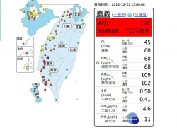 環保署表示,今(22)日天氣穩定氣流停滯,擴散條件不佳,污染物持續累積,加上背風渦流影響,污染物逐漸由南往北移動,其中嘉義的AQI更出現158的紅色燈號,空氣品質對所有族群不健康。(圖/環保署空氣監測網) 今(12月22日)是二十四節氣中的冬至,依中央氣象局觀測資料顯示,由於大氣環境穩定,各地多是多雲到晴的天氣,高溫都可來到27度,是個「暖」冬...... [閱讀更多]