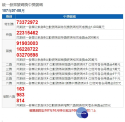 財政部9月25日開出107年7、8月期統一發票中獎號碼,千萬元特別獎號碼為73372972、200萬元特獎號碼22315462。(圖/財政部財稅入口網) 今(107)年9-10月期統一發票將於25日開獎,但前一期開出11張的7-8月統一發票千萬特別獎,至今仍有8張未兌領;16張200萬元特獎也有8張未兌領。財政部表示,兌獎期限至明(108)年1...... [閱讀更多]
