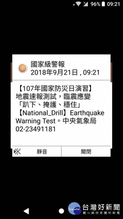 測試緊急訊息發布機制,內政部表示,9月20日上午9時21分中央氣象局會發布國家級地震測試簡訊。(圖/台灣好新聞編輯部) 1999年9月21日凌晨1時47分,台灣發生921大地震,造成2415人死亡、11305人受傷、51711間房屋全倒、53768間房屋半倒的重大傷亡。為記取教訓,行政院於2002年將每年9月21日訂為「國家防災日」。如今為測試...... [閱讀更多]