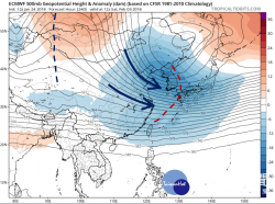 最新(24日20時)歐洲中期預報中心(ECMWF)模式,模擬下週六(3日)20時500百帕天氣圖顯示,槽線(紅虛線)從日本海延伸至台灣,槽後西北流(藍箭頭)導引「極地大陸氣團」南下;負距平(藍色調)中心在韓國附近,「寒潮爆發」才剛過其頂盛期。(圖/(翻攝「三立準氣象·老大洩天機」) 中央氣象局表示,下周受到強烈大陸冷氣團影響,各地氣溫驟降,冷...... [閱讀更多]