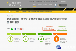 有網友在國發會的公共政策網路參與平台提案,提議對酒駕累犯、性侵犯及對幼童傷害等增設刑法懲罰方式增加鞭刑制度,該提案已獲25222位以上網友覆議。權責機關法務部也回覆行政院政務委員唐鳳將於12月1日(週五)召開協作會議,邀請提案人、附議人、權責機關法務部開會討論鞭刑議題。(圖/國發會公共政策網路參與平台) 台灣雖然對酒後駕車、性侵害相關罪行,訂有一定程...... [閱讀更多]