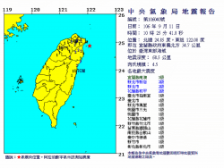今(11)日上午10時25分在宜蘭東部外海發生芮氏規模4.5地震,深度為68.5公里,最大震度為宜蘭南澳3級。(圖/中央氣象局提供) 中央氣象局地震測報中心觀測,今(11)日上午10時25分在宜蘭東部外海發生芮氏規模4.5地震,深度為68.5公里,最大震度為宜蘭南澳3級。 氣象局表示,根據地震測報中心地震報告,這起地震震央位在宜蘭縣政府東偏北34...... [閱讀更多]