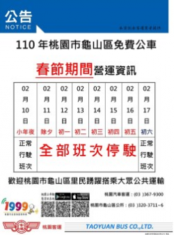 正常行駛:110年02月10日(小年夜)及110年02月17日(年六) 請繼續往下閱讀... 班次停駛:110年02月11日~110年02月16日 「iBus_桃園」提供民眾查詢公車動態資訊APP 1.體溫超過37.50C者請勿搭乘。 2.防疫新生活運動,請配合防疫。 3.搭乘者須配戴...... [閱讀更多]