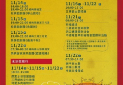 活動時間:109年11月14日~年11月22日 活動地點:桃園市楊梅區高山頂啟明宮/桃園市楊梅區高榮里18幼獅路二段390之1號1樓 活動內容: 三界爺主題特展 三界爺同堂來相聚/祈福繞境/消災轉運賜法會 不插電音樂祈福晚會暨摸彩 演出人員/黃于娟、吉娜罐子、在地協會團體同台共演 三界爺謝平安客家大戲、祈福三獻禮、令旗交接儀式 ...... [閱讀更多]