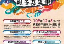 活動時間:109年12月05日 09:00~16:00 活動地點:桃園市立平鎮高級中學/桃園市平鎮區北興里33鄰環南路三段100號1樓運動場 活動內容: 舒食愛心園遊會/我愛Hakka手作蔬食趣 請繼續往下閱讀... 慈善公益義賣捐助 15:10~15:40 當日義賣所得捐助弱勢孩童 蔬跑親子接力...... [閱讀更多]