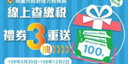 桃園市政府地方稅務局為鼓勵民眾以電子方式傳送繳款書、轉帳通知及證明服務,並持續推廣線上查繳稅,於109年5月20日辦理線上查繳稅禮券三重送-第1重使用牌照稅公開抽獎活動,自109年3月30日至5月2日止,利用地方稅申報作業網站申請本市「電子方式傳送繳款書、轉帳通知及證明服務」+線上查繳稅成功即可參加抽獎,電腦隨機抽獎166名(本次符合抽獎資格名單未達200名),各得全家便...... [閱讀更多]