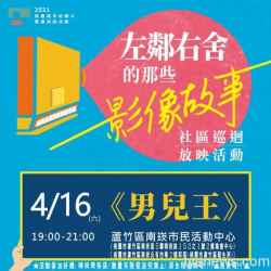 活動時間:111年04月16日(六)➢19:00~21:00(請配合防疫採實聯制請提早入場) 活動地點:桃園市蘆竹區南崁市民活動中心 活動內容: 放映影片:《男兒王》 參加好禮:時尚環保袋/數量有限發送完為止 請繼續往下閱讀... 目前疫情二級警戒,要勤洗手及實施採實名制 1.體溫超過37.50C者請勿前...... [閱讀更多]