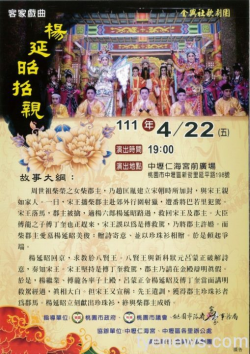 111年桃園市中壢區中壢仁海宮聖誕千秋暨建廟196週年慶紀念活動 客家大戲:金興社歌劇團《楊延昭招親》 請繼續往下閱讀... 活動時間:111年04月22日(五)晚上7:00~晚上9:00(請配合防疫採實聯制請提早入場) 活動地點:財團法人中壢仁海宮對面廣場 活動內容: 劇目:金興社歌劇團『楊延昭招親』客...... [閱讀更多]