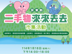 【記者林家慶報導】 又到年終大掃除的時候,有堆放在家裡生灰塵長蜘蛛網想要「斷捨離」又捨不得的物品嗎?屏東縣政府環保局幫大家解決困擾!在114年1月18日下午兩點至六點於屏東市千禧公園舉辦二手市集活動,提供民眾一個二手物交換平台,讓民眾在大掃除的同時,也可以整理家中閒置且堪用的物品,讓每樣二手物找到新主人,資源循環再利用。 ...... [閱讀更多]