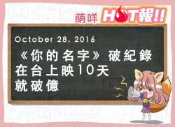 【萌咩HOT報】10月28日 網路的有趣HOT話題 2016-10-28 ▼萌咩HOT報!10/28▼ ||話題|| 《你的名字》破紀錄 在台上映10天就破億 http://bit.ly/2eYdRTA ━━━━━━━━━━━━━━━━━ 《你的名字》最近實在太火了! ...... [閱讀更多]