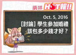 【萌咩HOT報】10月5日 網路的有趣HOT話題 2016-10-05 ━ ▼萌咩HOT報!10/05▼ ━━ ||話題|| 學生參加婚禮該包多少錢才好? https://goo.gl/1byS7d ━━━━━━━━━━━━━━━ 說到要包紅包…編編們每次都...... [閱讀更多]