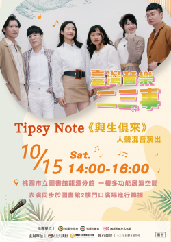 桃園市立圖書館主辦今(2022)年第二場「臺灣音樂二三事」邀請到的是成立於2019年創團的微醺音符Tipsy Note,由6位各自在不同領域中斜槓阿卡貝拉表演的唱將所組成。才剛成立不久就獲得2019年TCMC國際重唱大賽社會組金牌、最佳爵士詮釋、最佳人聲打擊、最佳主唱等獎項,他們精湛的演唱實力在許多企業尾牙中獲得好評。此次活動於10月15日在市圖龍潭分館多功能展演空間,邀請大家一起享受...... [閱讀更多]
