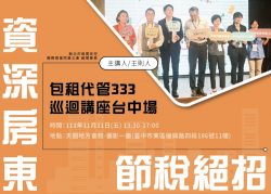 星鴻社會住宅包租代管董事長王則人(大仁哥)11月11日(五)在台中天圓地方會館舉辦公益講座,會中以資深房東的身分跟與會者分享了多年以來的租屋經驗,以及身為房該如何光明節稅。會中精準的提出了各種房東會遇到的難題,並鉅細靡遺的告訴與會者該如何面對,同時詳細說明加入社宅計劃的好處。 星鴻社會住宅包租代管董事長王則人(大仁哥)11月11日(五)在台中天圓地方會館舉辦公益講座...... [閱讀更多]