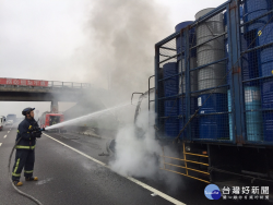 中山高南下北斗路段發生火燒車 大貨車燒成廢鐵造成回堵2公里 國道中山高南下216公里北斗路段,22日上午發生火燒車意外,一部從新竹南下高雄的大貨車,行駛中不知為何車頭突然冒煙起火燃燒,駕駛潘姓駕駛連忙停到路肩,這一起火燒車一度造成大塞車,消防局獲報出動消防分隊前往搶救,大貨車燒成廢鐵。路過用路人減速查看,驚呼:「後面還有油桶!」 國道三隊交通組長...... [閱讀更多]