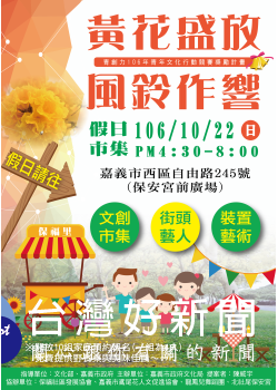 黃花盛放‧風鈴作響 嘉義市政府文化局舉辦「青創力106年嘉義市青年文化行動競賽獎勵計畫」,陳威宇先生策劃「黃花盛放‧風鈴作響」計畫獲得個人組銅獎,將於10月22下午4時於本市保福里保安宮前廣場舉行市集活動作為本次計畫成果展現。 文化局表示,為了鼓勵具有創新能量的青年,發揮社會服務與公民行動力參與,並鼓勵青年投入社區及文化弱勢環境等發展。今年持續推...... [閱讀更多]