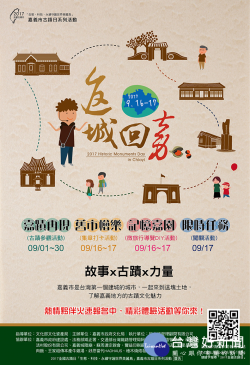 嘉義市古蹟日返程回嘉 傳統工藝手作真正夯 2017全國古蹟日預備起跑了,為響應國際文化遺產保護觀念提昇,讓我國民眾從世界的角度重新看到臺灣文化資產的珍貴性,今年全國古蹟日以「生態、科技、永續守護世界美麗島」為主題,整個九月份都圍繞著的自然生態、傳統工藝、科技、永續的氛圍中,嘉義市政府文化局也結合古蹟導覽、手作DIY、限時任務,融入傳統工藝,體驗手感印...... [閱讀更多]