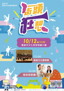 「街頭狂想 樂音跨時代」 雙十國慶連假壓軸登場 嘉義市政府文化局所舉辦的「2019嘉義市社區劇場藝術季-街頭狂想」,堂堂邁入壓軸場演出,原定9月15日(日)15:30「樂音.跨時代」節目,因受豪雨影響,為確保參與民眾之安全,將活動延期至10月12日 (六) 15:00於嘉義市政府文化局音樂廳大廳壓軸登場,讓精彩表演持續延燒。 「嘉義市社區...... [閱讀更多]