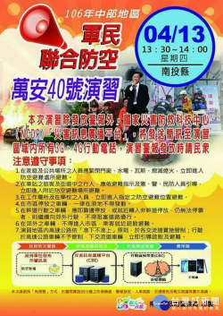 中部地區言13日下午舉行萬安演習。 106年中部地區軍民聯合防空萬安40號演習訂於4月13日下午1時30分舉行,這次演習除發送出警報,國家災害防救科技中心「災害訊息廣播平台」,將會發送簡訊到區域內所有3G和4G行動電話,南投縣警察局特籲請民眾配合,全程約30分鐘。 南投警察局表示,警報響起後在家庭及公共場所的民眾請緊閉門窗水電瓦斯等,並熄滅煙火,...... [閱讀更多]