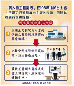 預立醫療決定的三步驟。(南投縣衛生局提供) 每一個人對於自己的疾病,都有知情、選擇與決定的權利。「病人自主權利法」於108年1月6日正式上路,南投縣衛生局提醒民眾,該法的實施可透過醫療自主權的表達,保障自己臨終的尊嚴與善終的權益。 南投縣有四家醫院提供此諮商服務。(衛生局提供) 南投縣衛生局指出...... [閱讀更多]