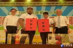 長榮大學董事長楊四海(右)、校長李泳龍(左)分別頒發10萬元、8萬元獎學金鼓勵。 長榮大學4日舉行106學年度「長大第一哩,府城輕旅行」新生始業典禮,邀請世界大學運動會獲得滑輪溜冰金牌的梁宣旼與舉重銀牌的陳士傑等人返校分享榮耀。長榮大學董事長楊四海、校長李泳龍分別頒發10萬元、8萬元獎學金鼓勵,得獎選手也回贈比賽簽名照相本,供學校留存紀念。 獲得...... [閱讀更多]