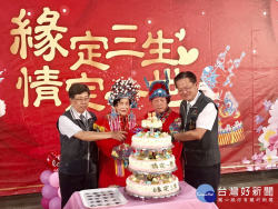 大里公所舉行金婚和鑽石婚表揚。林重鎣攝 大里區公所於29日上午8時30分在台中市兒童青少年福利服務中心舉辦「金婚鑽石婚暨白金婚紀念表揚活動」,由仁化里辦公處的社 區媽媽隊員們扛著大紅喜氣的古禮,浩浩蕩蕩、熱鬧的迎親隊伍帶領 著臺中市政府消防局蕭煥章局長及周崇琦區長沿途分送喜糖與在場伉 儷及來賓,並帶來耳目一新原住民式迎親舞將穿著古裝紅袍馬褂、 ...... [閱讀更多]