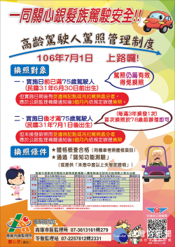 交通部為避免不適宜駕駛的長輩發生意外,特規劃「高齡駕駛人駕照管理制度」。(圖/高雄市區監理所提供) 交通部自106年7月1日起推動『銀髮族駕駛關懷方案』中所規劃的「高齡駕駛人駕照管理制度」,係針對未來年滿75歲駕駛人如要繼續駕駛車輛,須通過體格檢查和認知功能測驗,方可換發3年效期的駕照。根據高雄市區監理所統計,轄區106年7月份符合高齡換照對象共47...... [閱讀更多]