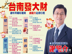 過年走春何處去?台南市立委候選人謝龍介日前公布過年走春行程,邀請民眾在春節期間來台南,跟著他按圖索驥一同拜廟祈福。謝龍介表示,台南擁有許多特色景點與廟宇,歡迎各地朋友新春到台南旅遊,和謝龍介一起過節。 謝龍介說,過年期間,競選團隊規劃一系列拜廟活動,從大年初一到大年初四,每日行程滿檔,一口氣跑完14區,除和民眾搏感情外,最主要是希望能為各地區的產...... [閱讀更多]