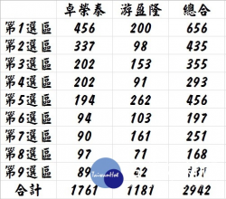 民進黨黨主席補選,台南市投票率明顯偏低,只有10.8%,投票結果卓榮泰獲得1761票,游盈隆為1181票。 民進黨黨主席補選,台南市選舉人數共2萬7224人,共設置南區、北區、安南區、永康區、新營區、佳里區、善化區、仁德區、玉井區9個投票所,黨員投票情形相當冷清,總共才投出2942票,投票率只有10.8%。 ...... [閱讀更多]