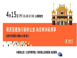 親民黨「最強行動辦公室」4月15日下午3:30~5:00,將前進台南大灣廣護宮,由主席宋楚瑜、立委李鴻鈞、陳怡潔、周陳秀霞在現場接受民眾陳情,不分黨派,一起關心台南大、小事。 親民黨「最強行動辦公室」繼去年5月份在高雄開張之後,6月份到基隆、7月份到宜蘭,8月份到蘭嶼,9月到台中市,現場皆有不少在地民眾反映地方問題,親民黨則透過立院黨團、立委、地方縣、市...... [閱讀更多]