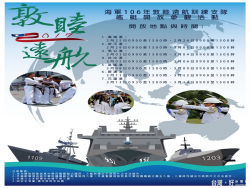 執行國內環島航行訓練及國外敦睦遠航訓練的海軍敦睦遠訓支隊,將於2月28日抵達台南安平商港商業碼頭,並於2月28日及3月1日開放民眾登艦參觀,登艦參觀民眾需攜帶身分證明文件,但不開放陸客參訪。 海軍敦睦遠訓支隊除由海軍派遣油彈補給艦『532磐石艦』及康定級巡防艦『1203西寧艦』兩艘軍艦靠港,同時為壯大軍容另指派2艘『86與87光六飛彈快艇』一併參展。此外...... [閱讀更多]