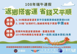 桃園監理站表示端午連續假期即將到來,公路總局自6月6日0時起至6月9日24時止推出各項搭乘客運的優惠措施。 桃園監理站表示端午連續假期即將到來,為服務返鄉及出遊旅客的需求,公路總局自6月6日0時起至6月9日24時止推出各項搭乘客運的優惠措施,只要搭乘交通部核定86條國道客運路線,即可享85折票價優惠,讓民眾省錢省力返鄉團圓;同時連假期間搭乘所...... [閱讀更多]