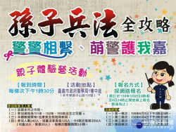 孫子兵法全攻略~警警相繫、萌警護我「嘉」親子體驗營開始報名囉! 「交通安全從小做起」,嘉義市政府警察局為建立正確路權觀念,訂於108年6月3日起至6月6日止,分4梯次每梯次60名(兒童30名、家長30名),在警察局1樓中庭辦理交通安全親子體驗營活動,體驗課程分為:「孫子兵法之始計篇」、「孫子兵法之謀攻篇」、「孫子兵法之作戰篇等」,以生動活潑、親...... [閱讀更多]