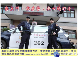 警察局貼心服務 讓您春節安心出遊 快樂回「嘉」 今年春節連續假期共有9天,為讓民眾安心出遊,不再擔憂住家安全,嘉義市政府警察局貼心推出「舉家外出住居安全維護服務」,服務對象也包括在台外僑,民眾如要舉家外出旅遊、返鄉探親時,可電話或親自至轄區派出所申請,亦可透過警察局全球資訊網(www.ccpb.gov.tw)/線上服務專區申辦此項服務,警察局會...... [閱讀更多]