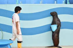 工讀生是你?海獅抱飼料桶站立直盯保育員 網笑:身分對調