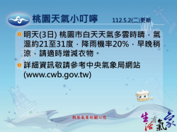 中央氣象局表示,今(3)日桃園市白天天氣多雲時晴,氣溫約22至31度,體感溫度為24至36度,紫外線燈號為「紅燈」過量級,須注意防曬。降雨機率20%,早晚稍涼,請適時增減衣物。也易有局部霧或低雲影響能見度,請民眾多加註意。 今日桃市白天天氣多雲時晴。圖:翻攝自氣象局 此外,氣象局指出,桃園市今日近海天氣晴時多雲有霧,偏北風,風力4至5陣風7級,上午轉4級陣...... [閱讀更多]