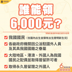 因應國際政經變局、通膨壓力上升,衝擊全球經濟與民生需求,行政院依「後強化經濟與社會韌性及全民共享經濟成果特別條例」辦理普發現金6000元,與全民共享經濟成果,最快4月有機會發放。雖然確切發放日期尚未出爐,不過財政部昨(23)日已公布領取資格及5種領取方式。 指定時間內符合發放資格,每人都能領6000元。圖:翻攝自財政部 財政部表示,指定時間內符合發放資格,...... [閱讀更多]