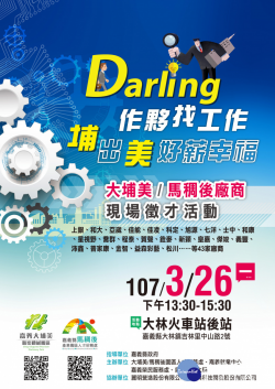 大埔美及馬稠後廠商急徵才,3月26日大林火車站等你來應徵 到了3月春暖花開之求職季,為提供廣大求職民眾就業媒合管道,雲嘉南分署嘉義就業中心即將在下週一107年3月26日(一)下午13時30分至15時30分於大林火車站後站廣場舉辦「Darling 作夥找工作埔出美好薪幸福」大埔美及馬稠後廠商現場徵才活動辦理大埔美廠商聯合徵才活動,預計邀請15家以...... [閱讀更多]