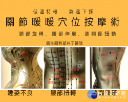迎接寒冬來襲,朴子醫院中醫科推出關節暖暖穴位按摩術 在寒冬來臨,一波波寒流來襲全台之際,許多民眾晨間起來常感覺有頭暈、腰部及膝蓋等關節痠痛,活動僵硬等症狀,朴子醫院中醫科特別發揮設計巧思,結合穴位按摩,肌肉伸展、關節活動,為民眾示範了一套關節暖暖穴位按摩術,以頸肩、腰部、膝部主要關節,作六個舒緩穴位活動。另以坊間流行的毛巾卷作輔助支撐,保護好頸椎、腰...... [閱讀更多]