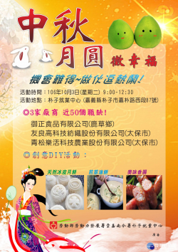 朴子就業中心10月3日舉辦「中秋月圓徵幸福」活動,做伙來創業DIY逗熱鬧 中秋佳節即將到來,勞動部勞動力發展署雲嘉南分署朴子就業中心為了進一步媒合民眾求職與廠商求才,在106年10月3日(星期二)09:00-12:30朴子就業中心舉辦「中秋月圓徵幸福」活動,特別邀請到御正食品有限公司、友良高科技紡織股份有限公司、青松樂活科技農業股份有限公司3家廠商,...... [閱讀更多]