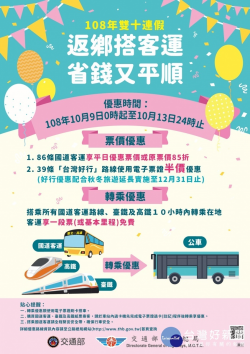 108年雙十連假返鄉搭公共運疏轉乘,省錢又平順 為鼓勵民眾於雙十連續假期搭乘公共運輸,紓解國道與地方交通壅塞,交通部公路總局訂自108年10月9日0時起至108年10月13日24時止共計5天,提供86條國道客運路線享優惠票價(或85折優惠)及39條台灣好行路線半價優惠,以及搭乘國道客運、高鐵、臺鐵轉乘在地客運1段票(或基本里程)免費等多項優惠措...... [閱讀更多]