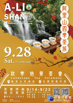 阿里山四季茶旅 秋季地景茶會 瑞峰1314觀景台 揭開茶會序曲 為建構阿里山茶文化體驗觀光廊道,交通部觀光局阿里山國家風景區管理處將於9月28日在圓潭生態園區及太興飛瀑步道舉辦「阿里山四季茶旅-秋季地景茶會」,延續今年阿里山四季茶旅的春、夏季節氣茶席氛圍營造的好評,秋季茶會以立秋、處暑、白露、秋分、寒露和霜降等六大節氣主題,由在地社區茶旅達人布...... [閱讀更多]