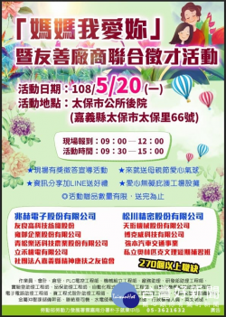 朴子就業中心5月20日「媽媽我愛妳」聯合徵才活動,求職送愛心氣球及茶包 為了慶祝溫馨母親節,勞動部勞動力發展署雲嘉南分署朴子就業中心鼓勵媽媽們能再投入職場,與嘉義縣太保市公所於108年5月20日(星期一)上午09:30-15:00,在太保市公所樂齡教室周邊廣場 (嘉義縣太保市太保里66號)共同舉辦「媽媽我愛妳」聯合徵才活動,共邀請了11家廠商釋...... [閱讀更多]